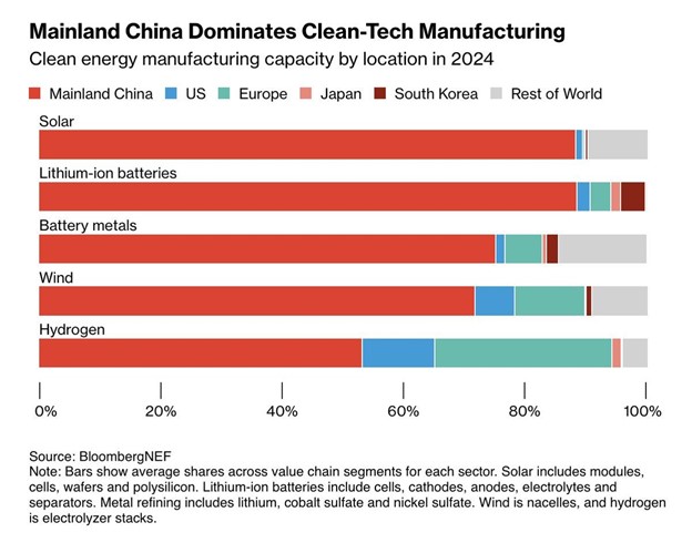 Currently, China produces approximately 80% of the world’s solar panels, 60% of its wind turbines, 70% of electric vehicles, and 75% of batteries — all at significantly lower